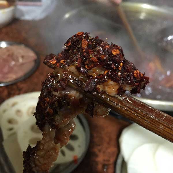二火锅的店面在小龙坎土湾车站旁,地铁站小龙坎2号出口步行几百米就能到,在一个居民小区里。招牌很不起眼。环境也说不上好,破破烂烂的,搭了个棚子,摆几张桌子,塑胶板凳围坐在一起便可以;但是尽管如此,为了品尝美食的人还是一波又一波的赶来。锅底是正儿八经的冷锅,一上桌看到的就是醇正的牛油锅底,干花椒与干辣椒密密麻麻的铺在炼制好的牛油底料上,旁边再放上一大块白花花的猪油,还有姜片和葱段点缀在旁边提味,看起来就让人吞口水。开火等待锅底融化,沸腾之后的火锅底料咕噜咕噜的翻滚冒泡,红通通的锅底火辣辣的冒着热气,牛油锅底红亮厚重、浓厚醇香!小编只想赶紧放东西下去煮起,享受美味。